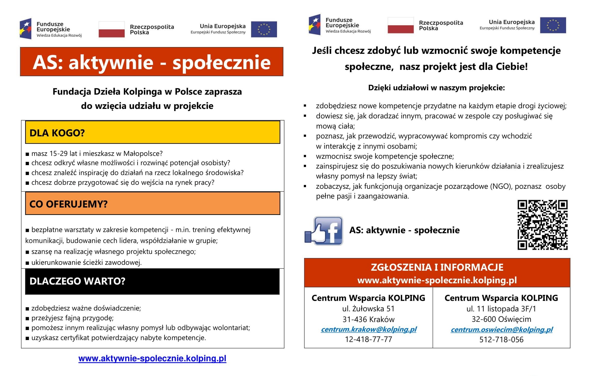 Fundacja Dzieła Kolpinga w Polsce zaprasza mieszkańców Małopolski w wieku 15-29 lat do skorzystania z projektu "AS: aktywnie – społecznie". Bezpłatne warsztaty pozwalają rozwinąć kompetencje i zdobyć doświadczenie, które pomagają przygotować się do wejścia na rynek pracy.