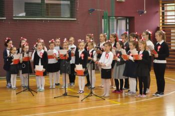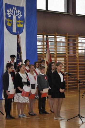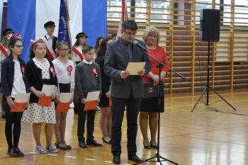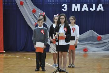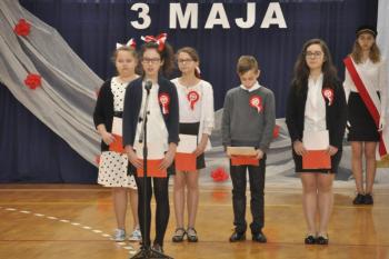 Uczniowie Szkoły Podstawowej zaprezentowali gościom oraz swoim koleżankom i kolegom słowno-muzyczny program, w którym patriotyczne wiersze i piosenki stanowiły artystyczną oprawę dla historycznych wydarzeń przypomnianych w zwięzłych relacjach. Słowa poloneza "Wiwat maj, trzeci maj" napisane krótko po uchwaleniu naszej pierwszej konstytucji harmonijnie współbrzmiały ze współczesną pieśnią Ernesta Brylla i Włodzimierza Korcza "Polskie skrzydła". Uczniowie przygotowali występ pod opieką nauczycieli: Małgorzaty Rolewskiej i Roberta Rydzonia. Po przedstawieniu wójt Albert Bartosz zapewnił uczniów, nawiązując do Krakowiaka Kościuszki ("Bartoszu, Bartoszu, Oj nie traćwa nadziei"), że nie brak mu wiary w młode pokolenie.