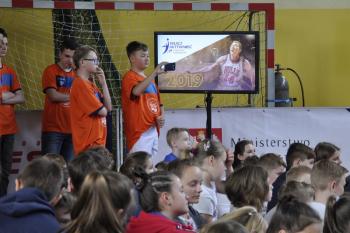 Kolejnym gościem był specjalista od koszykarskich wsadów Aleksander Maślanka, który podzielił się z młodymi grojczanami życiową pasją, prezentując prawdziwe akrobacje pod koszem. Młodzież nagradzała jego ewolucje wrzawą i brawami. A kiedy przeskakiwał nad trójką uczniów, nawet nauczyciele przecierali oczy ze zdumienia.