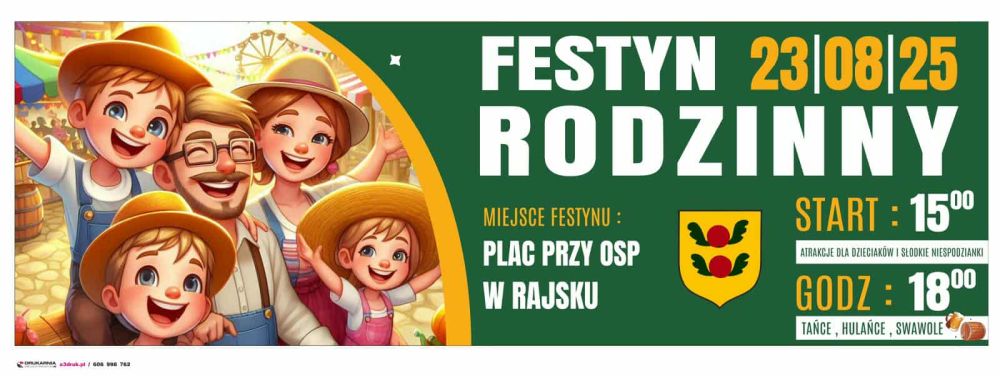 Rada Sołecka wraz z sołtysem wsi Rajsko serdecznie zapraszają na Festyn Rodzinny, który odbędzie się 23 sierpnia 2025 (sobota) przy OSP Rajsko. W programie od godziny 15:00 do 18:00 bezpłatne atrakcje dla dzieci między innymi słodki poczęstunek, gry, zabawy,dmuchaniec oraz wiele innych niespodzianek. Od godziny 18:00 zabawa taneczna przy muzyce. Na miejscu będzie również dostępna bogata oferta gastronomiczna. Serdecznie zapraszamy i zachęcamy do wspólnego spędzenia czasu!