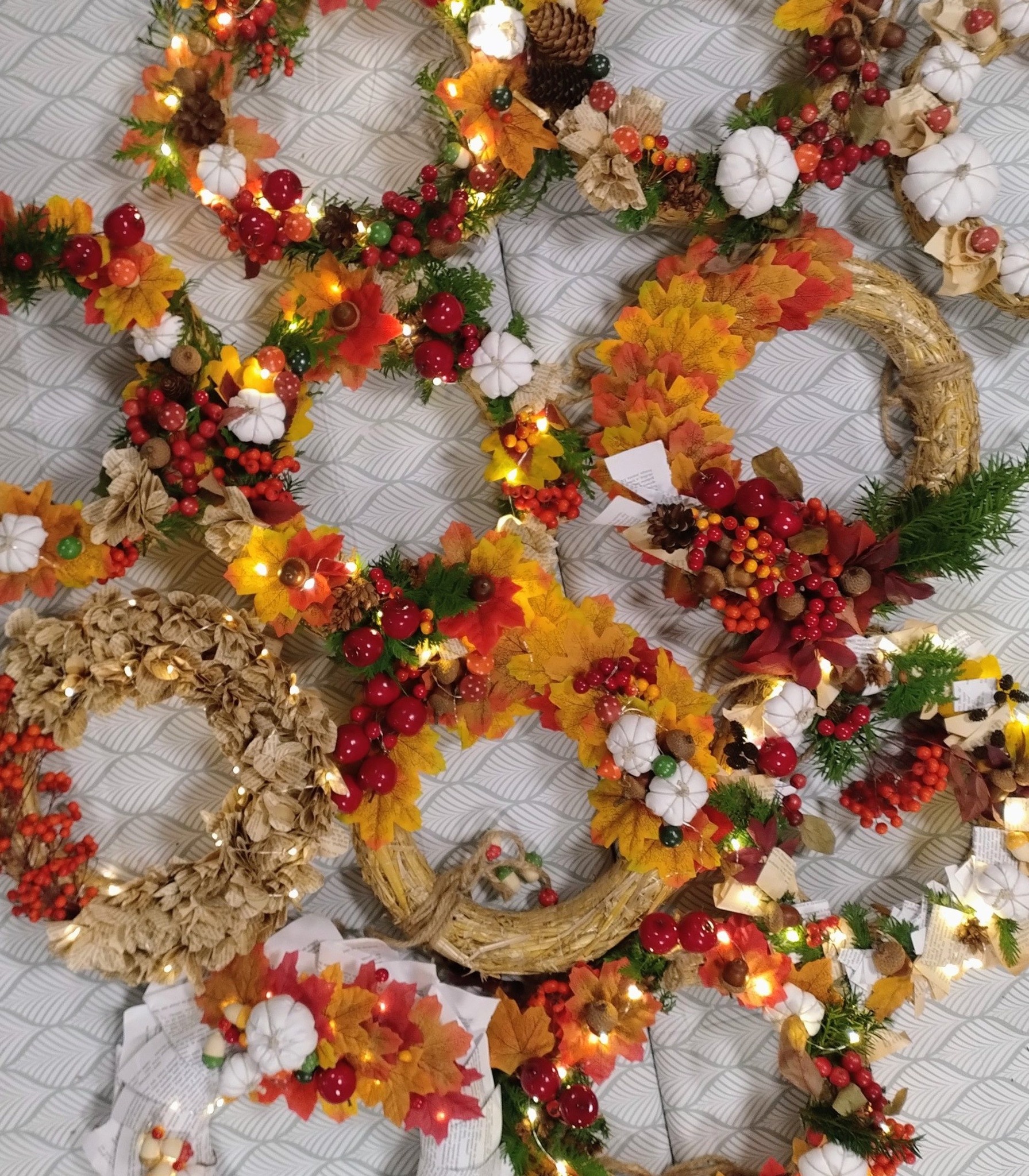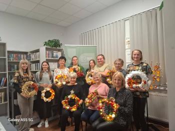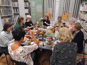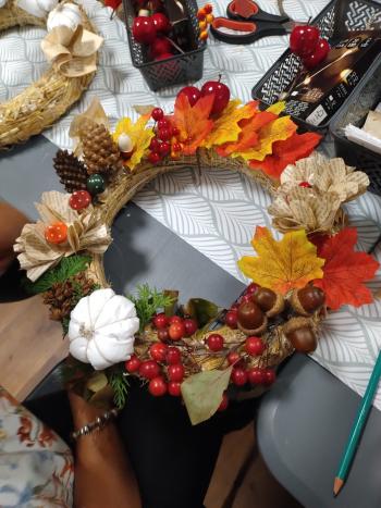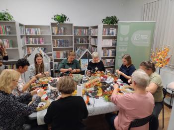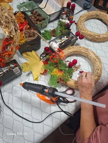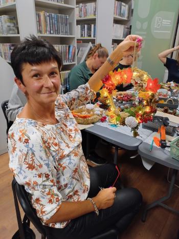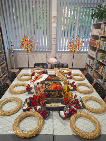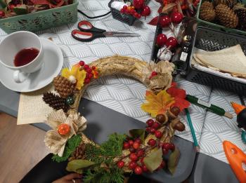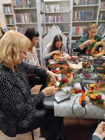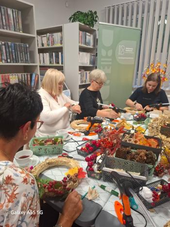 Po literackiej części przyszedł czas na warsztaty tworzenia jesiennych wianków. Z naturalnych skarbów jesieni, słomianych podkładów i starych książkowych stron powstawały małe dzieła sztuki. Każdy wianek był inny, a jednocześnie wszystkie razem tworzyły przepiękną mozaikę wspólnej pasji i pozytywnej energii.