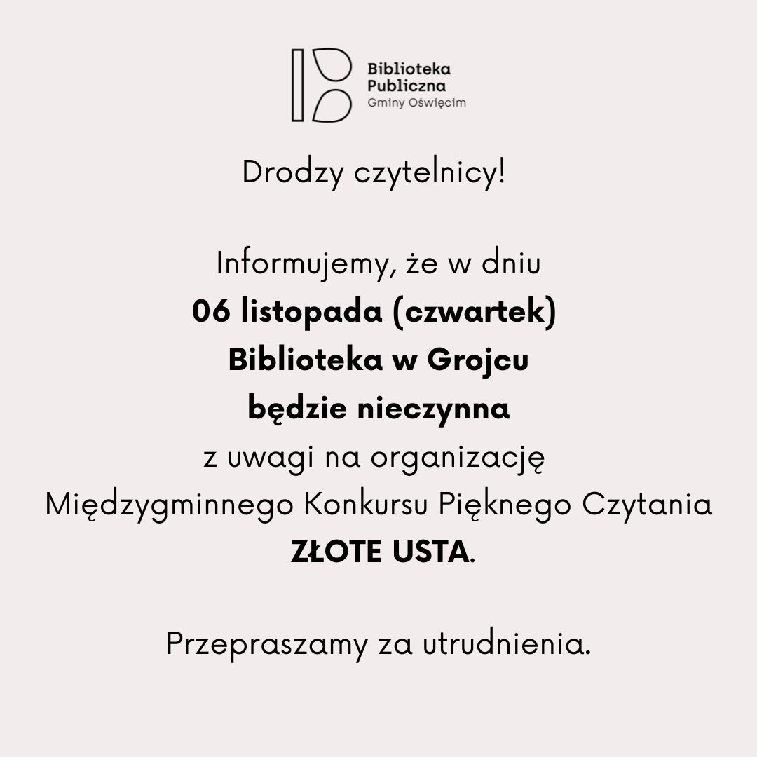 Informujemy, że w dniu 06 listopada (czwartek) Biblioteka w Grojcu