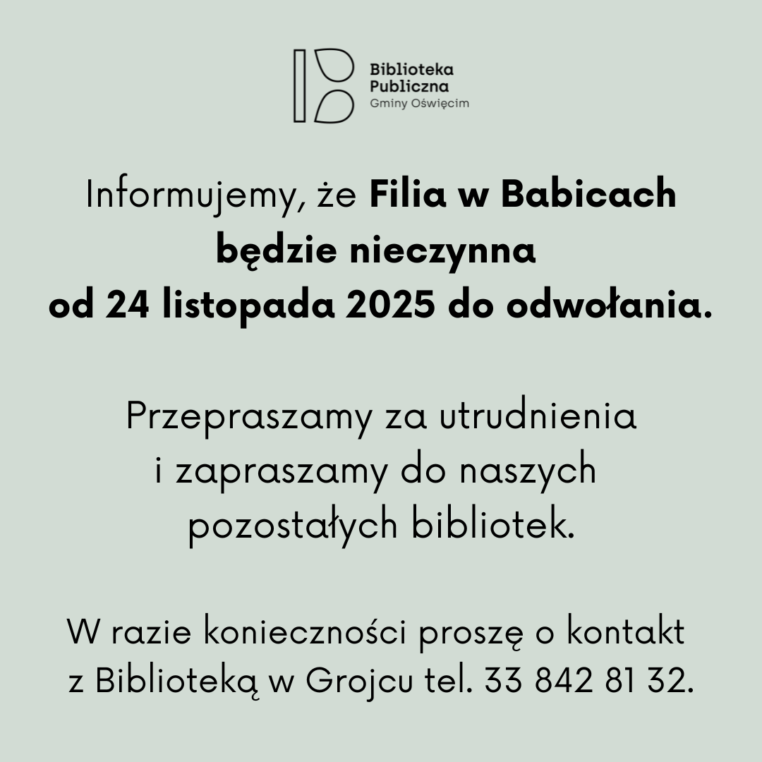 Informujemy, że Filia w Babicach będzie nieczynna od dnia 24.11 do odwołania.