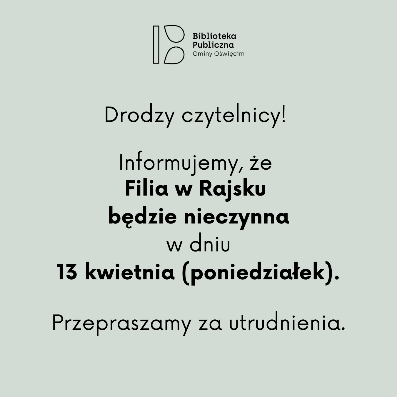 Informujemy, że Filia w Rajsku będzie nieczynna w dniu 13 kwietnia (poniedziałek)