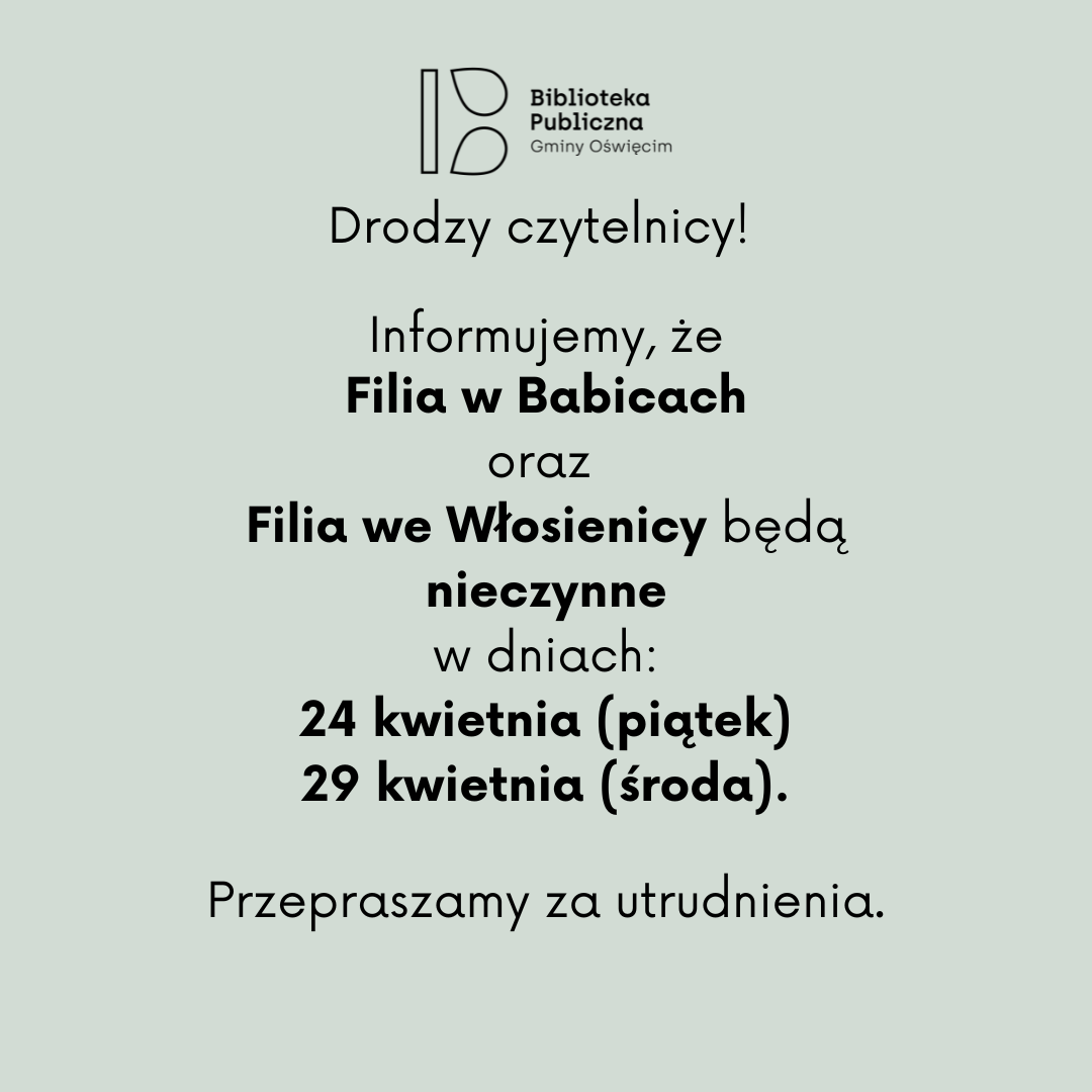 Informujemy, że Filia w Babicach oraz Filia we Włosienicy będą nieczynne w dniach: