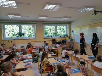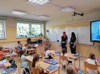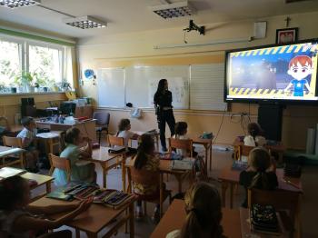 W piątkowy poranek naszych pierwszoklasistów odwiedziły dwie sympatyczne Panie Policjantki z Wydziału Drogowego Komendy Powiatowej Policji z Oświęcimia. W ciekawy sposób przypomniały One dzieciom podstawowe zasady ruchu drogowego, zaprezentowały film edukacyjny i wyjaśniły co robić, gdy spotkamy obce osoby w drodze do domu.